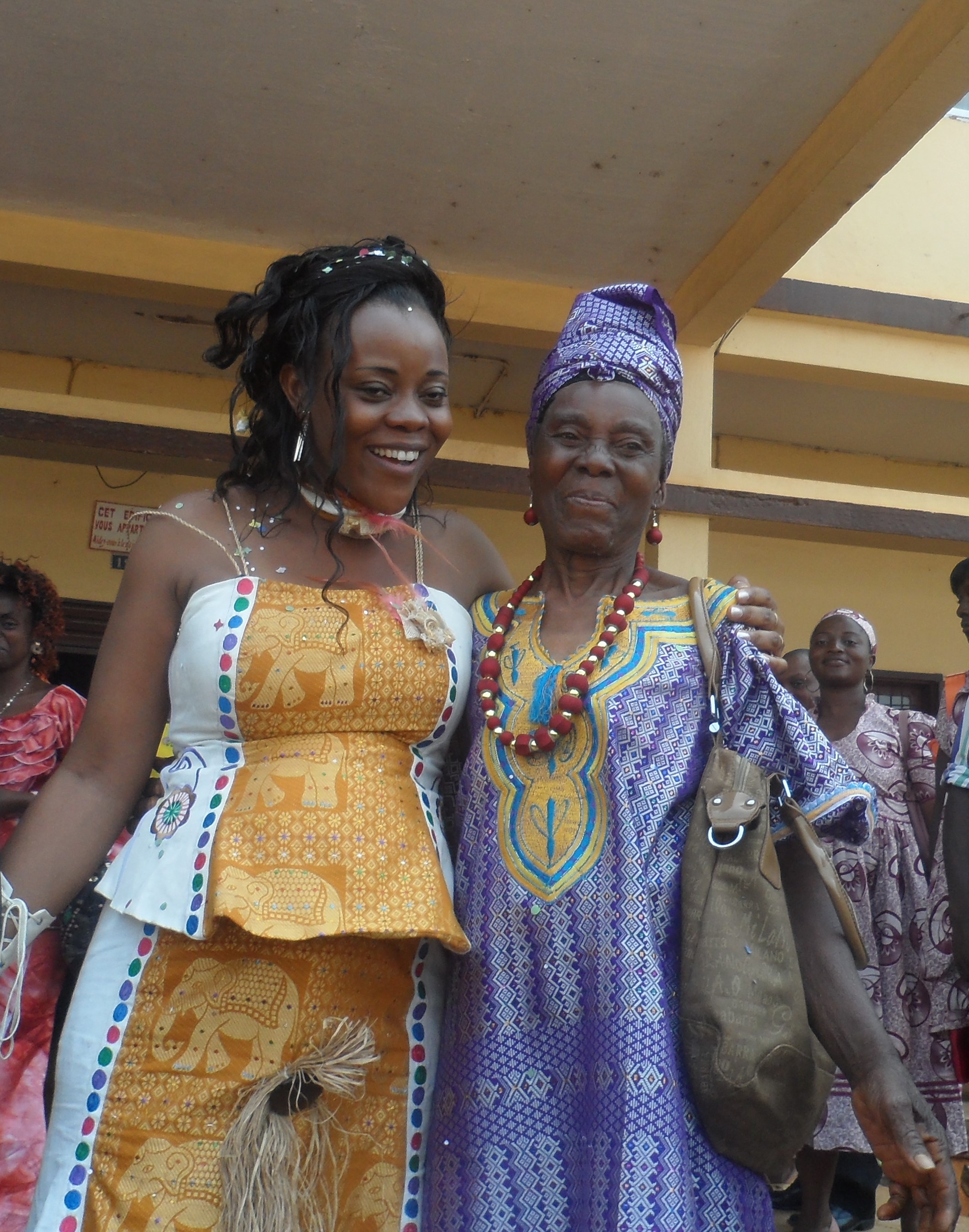 Suivant comment on le porte il a plusieurs significations. Dans la première photo où je le porte il permet à tout ceux qui sont venus à la célébration de vie de maman de savoir que je fais partie des orphelines de la défunte. Sur la 2ème image le morceau attaché en cravate à mon cou permet d’informer ceux qui sont dans la cour que c’est moi qui remplace maman désormais dans ses attributs de gestions de sa descendance (son héritière)